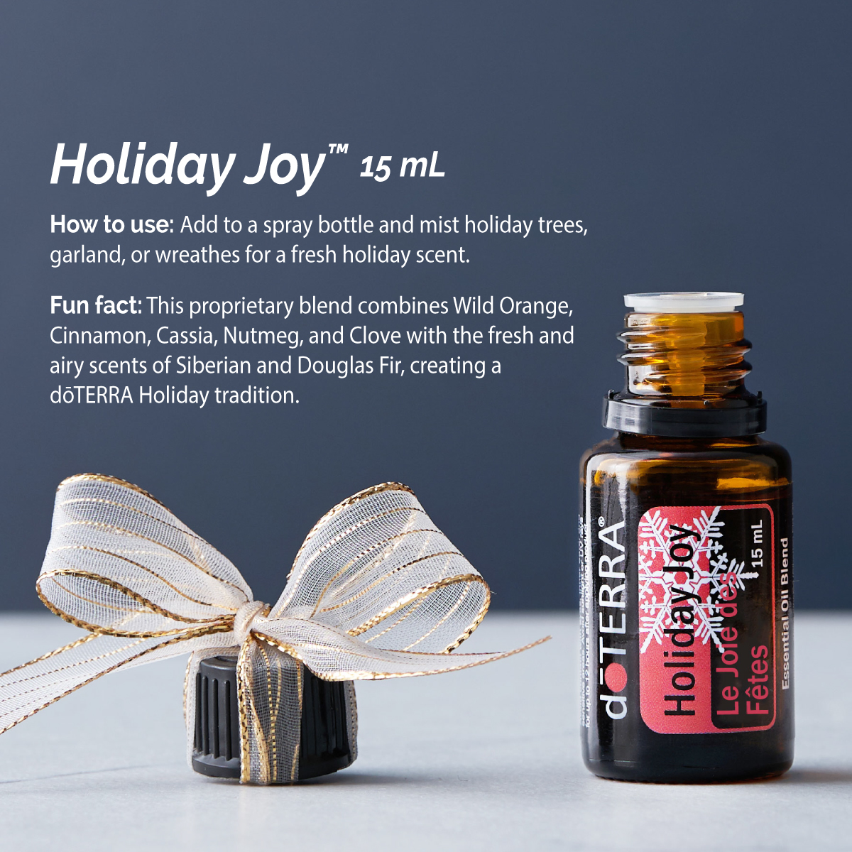 Fill your home with the inviting, warm, sweet aroma of Holiday Joy. Can be diffused every day to purify the air and uplift the spirit.